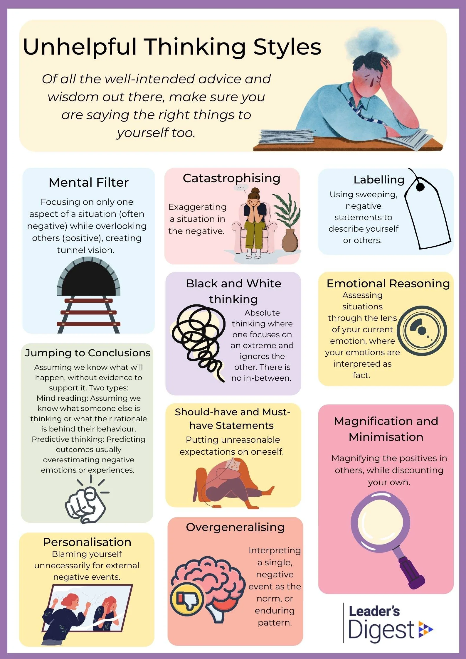 Black & white thinking, mental filter, jumping to conclusions and catastrophising are the traits I struggle with. Recognising these in the moment, or at least in reflection, has helped me in my recovery.