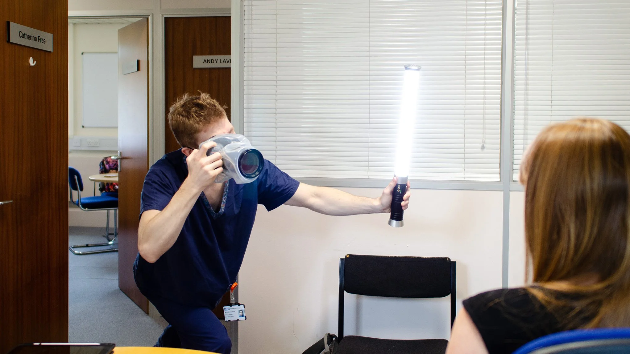 Natural light was harnessed where possible, but additional light was necessary for almost all participants, even where windows were present. I specifically sourced a battery-powered continuous light with a cylindrical form that could be handheld and easily disinfected by sterilising wipes. Continuous light was chosen over flash to minimise distraction to patients and staff in the clinical environment. This setup provided a mobile and minimally-contaminable method for travelling around the hospital. The Infection Prevention & Control Team endorsed this approach and requested more information to inform their future advice and practice.