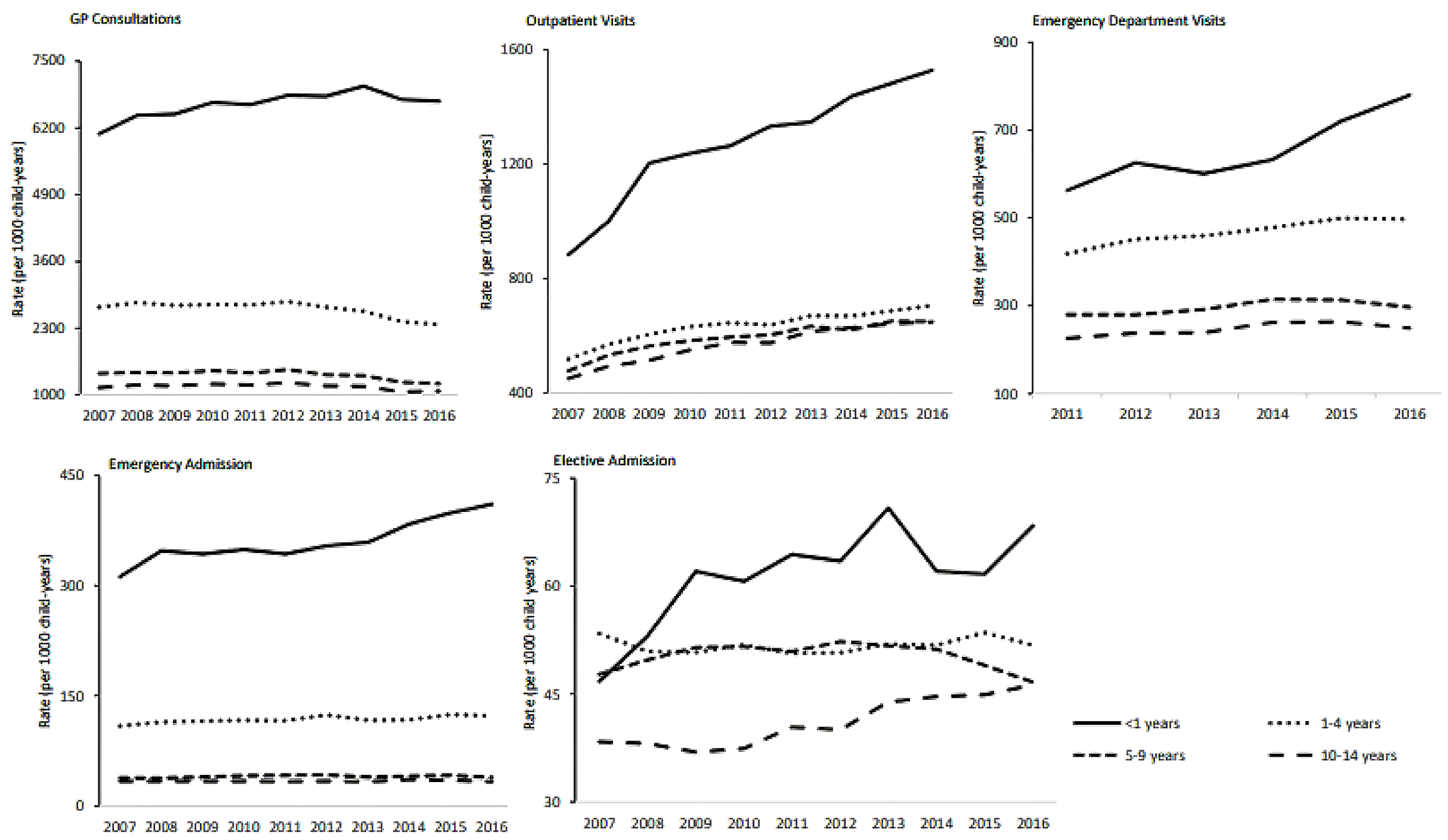 Ruzangi J, Blair M, Cecil E, et al, Trends in healthcare use in children aged less than 15 years: a population-based cohort study in England from 2007 to 2017,, BMJ Open 2020;10:e033761. doi: 10.1136/bmjopen-2019-033761